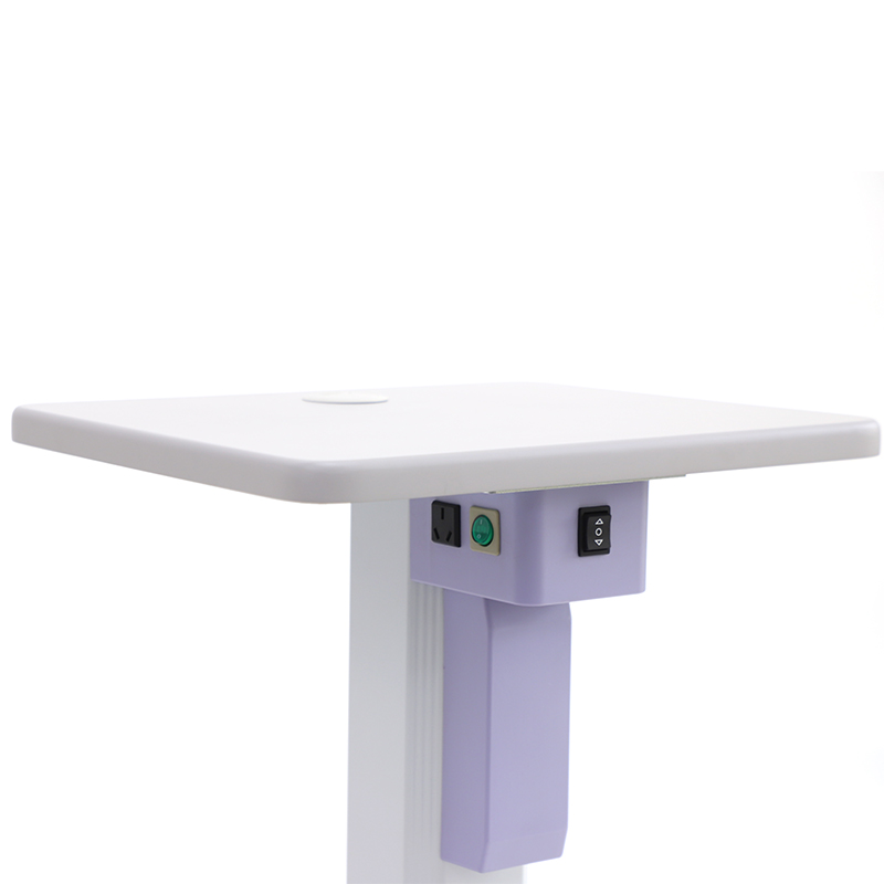 Mesa electrica compacta portatil. Con base de metal y ruedas lo que garantizan durabilidad y facilidad de movimiento. Su única toma de corriente justo debajo de la mesa ofrece una fácil conexión al equipo.